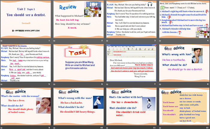 关键词:仁爱版八年级上册英语PPT课件免费下载,《You should see a dentist》PPT下载,.PPT格式;