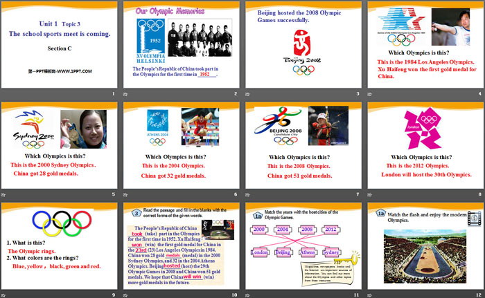 The People’s Republic of China _______ (take) part in the Olympics for the first time in 1952. Xu Haifeng _______ (win) the first gold medal for China in the _____ (23) Los Angeles Olympics in 1984. China won 28 gold _______ (medal) in the 2000 Sydney Olympics, and 32 in the 2004 Athens Olympics. Beijing _______ (host) the 29th Olympic Games in 2008 and China won 51 gold medals. We hope that China ________ (win) more gold medals in the future.