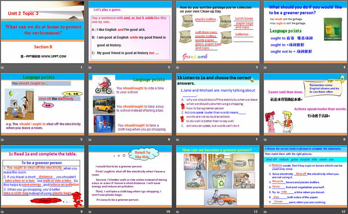 关键词:仁爱版九年级上册英语PPT课件免费下载,《What can we do at home to protect the environment?》PPT下载,.PPT格式;