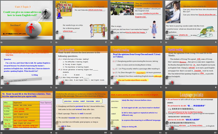关键词:仁爱版九年级上册英语PPT课件免费下载,《Could you give us some advice on how to learn English well?》PPT下载,.PPT格式;
