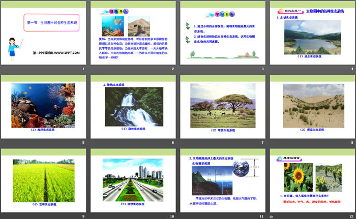 关键词:苏教版八年级上册生物PPT课件免费下载,生物圈中的各种生态系统PPT下载,.PPT格式;