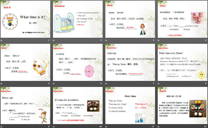关键词:牛津译林版三年级下册英语PPT课件免费下载,What time is it?PPT下载,.PPT格式;