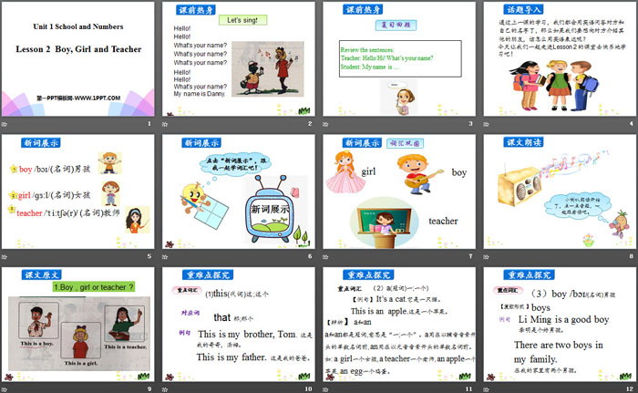 关键词:冀教版三年级上册英语PPT课件免费下载,Boy,Girl and TeacherPPT下载,School and NumbersPPT下载,.PPT格式;