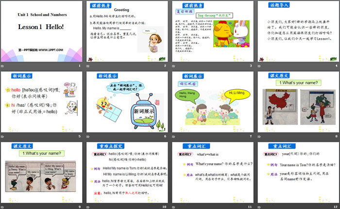 关键词:冀教版三年级上册英语PPT课件免费下载,Hello!PPT下载,School and NumbersPPT下载,.PPT格式;