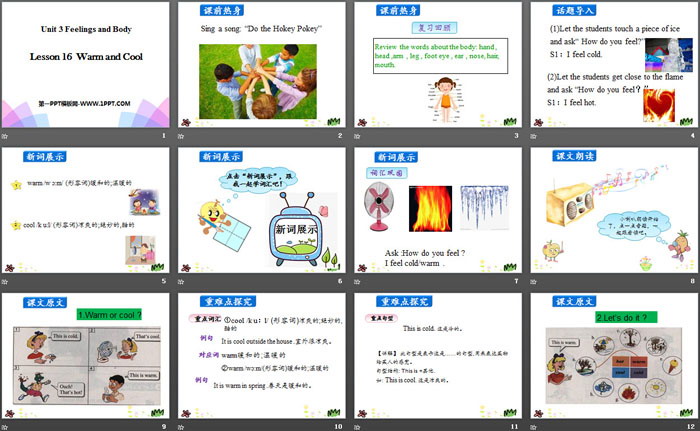 关键词:冀教版三年级上册英语PPT课件免费下载,Warm and CoolPPT下载,Feelings and BodyPPT下载,.PPT格式;