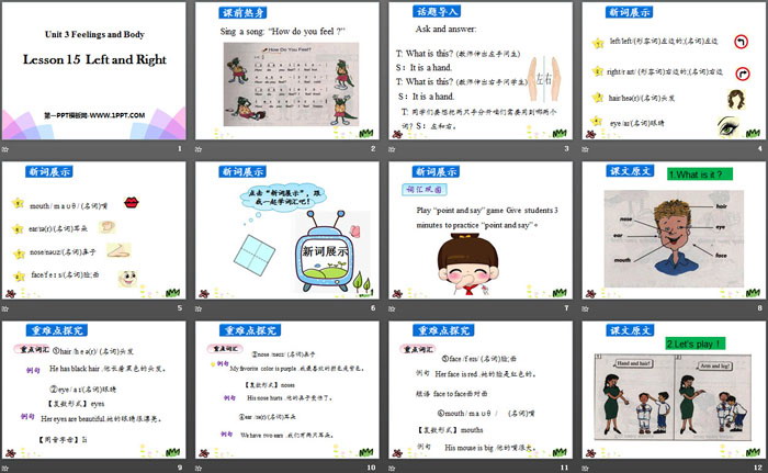 关键词:冀教版三年级上册英语PPT课件免费下载,Left and RightPPT下载,Feelings and BodyPPT下载,.PPT格式;