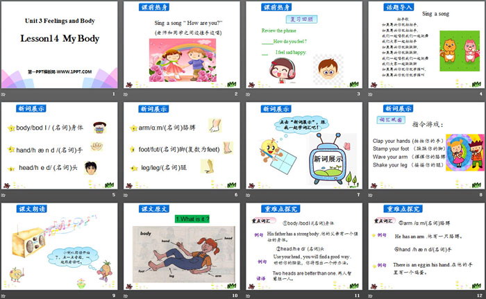 关键词:冀教版三年级上册英语PPT课件免费下载,My BodyPPT下载,Feelings and BodyPPT下载,.PPT格式;