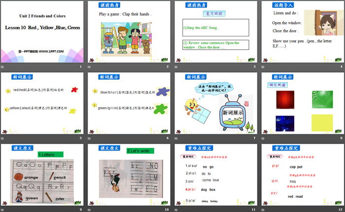 关键词:冀教版三年级上册英语PPT课件免费下载,Red,Yellow,Blue,GreenPPT下载,Friends and ColoursPPT下载,.PPT格式;