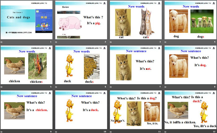关键词:冀教版三年级下册英语PPT课件免费下载,Cats and dogsPPT下载,Animals on the FarmPPT下载,.PPT格式;