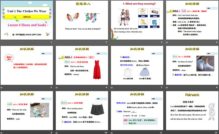 关键词:冀教版四年级上册英语PPT课件免费下载,Shoes and SocksPPT下载,The Clothes We WearPPT下载,.PPT格式;