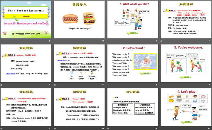 关键词:冀教版三年级下册英语PPT课件免费下载,Hamburgers and Hot DogsPPT下载,Food and RestaurantsPPT下载,.PPT格式;