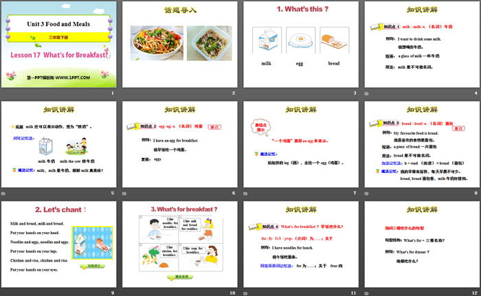 关键词:冀教版三年级下册英语PPT课件免费下载,What's for Breakfast?PPT下载,Food and MealsPPT下载,.PPT格式;