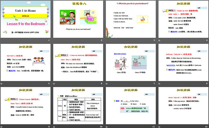 关键词:冀教版四年级上册英语PPT课件免费下载,In the BedroomPPT下载,At HomePPT下载,.PPT格式;