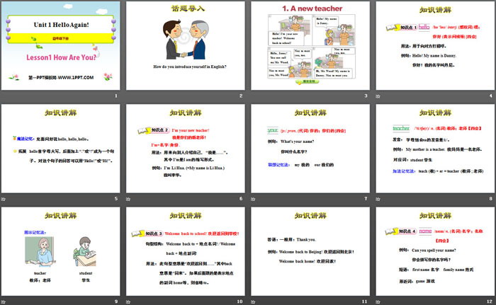 关键词:冀教版四年级下册英语PPT课件免费下载,How are you?PPT下载,Hello Again!PPT下载,.PPT格式;