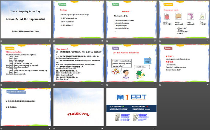 关键词:冀教版四年级上册英语PPT课件免费下载,At the SupermarketPPT下载,Shopping in the CityPPT下载,.PPT格式;