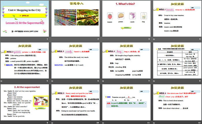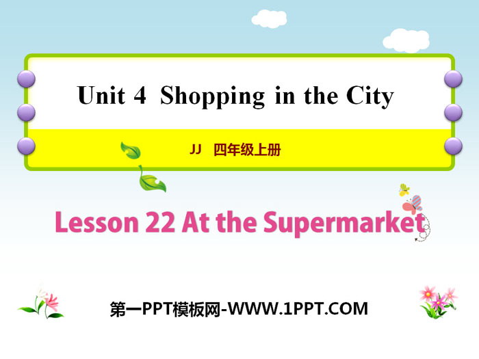 关键词:冀教版四年级上册英语PPT课件免费下载,At the SupermarketPPT下载,Shopping in the CityPPT下载,.PPT格式;