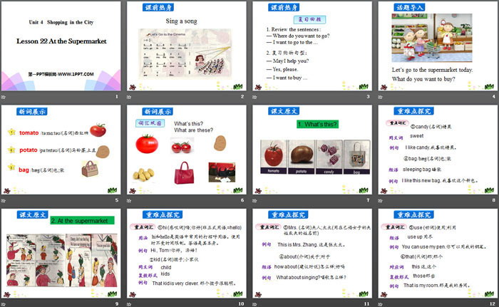 关键词:冀教版四年级上册英语PPT课件免费下载,At the SupermarketPPT下载,Shopping in the CityPPT下载,.PPT格式;