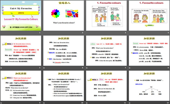 关键词:冀教版四年级下册英语PPT课件免费下载,My Favourite ColoursPPT下载,My FavouritesPPT下载,.PPT格式;
