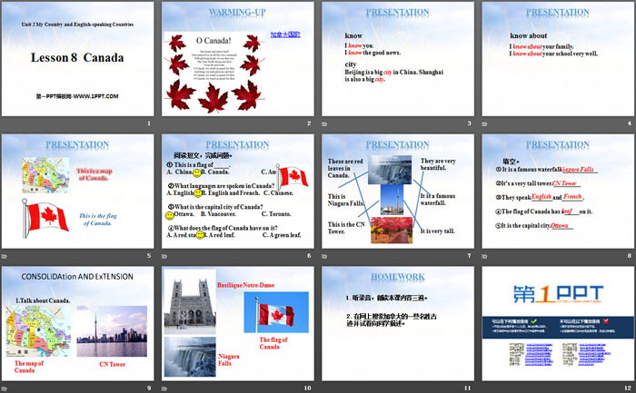 关键词:冀教版五年级上册英语PPT课件免费下载,CanadaPPT下载,My Country and English-speaking CountriesPPT下载,.PPT格式;