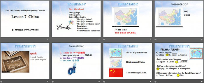 关键词:冀教版五年级上册英语PPT课件免费下载,ChinaPPT下载,My Country and English-speaking CountriesPPT下载,.PPT格式;