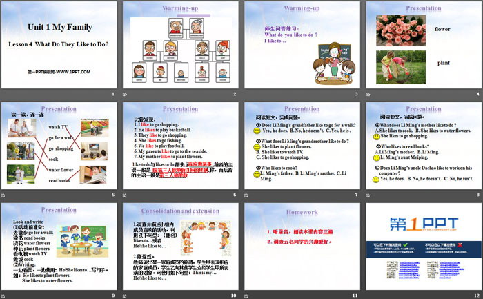 关键词:冀教版五年级上册英语PPT课件免费下载,What Do They Like to Do?PPT下载,My FamilyPPT下载,.PPT格式;