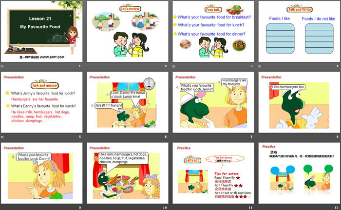关键词:冀教版四年级下册英语PPT课件免费下载,My Favourite FoodPPT下载,My FavouritesPPT下载,.PPT格式;