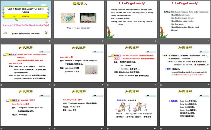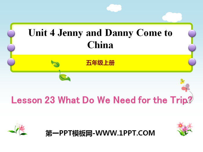 关键词:冀教版五年级上册英语PPT课件免费下载,What Do We Need for the Trip?PPT下载,Jenny and Danny Come to ChinaPPT下载,.PPT格式;