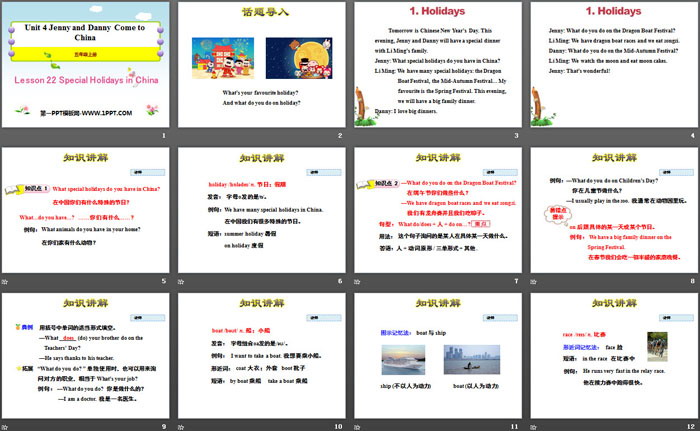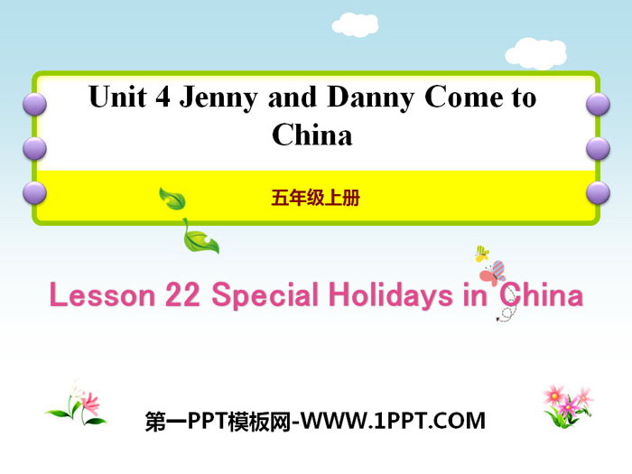 关键词:冀教版五年级上册英语PPT课件免费下载,Special Holiday in ChinaPPT下载,Jenny and Danny Come to ChinaPPT下载,.PPT格式;