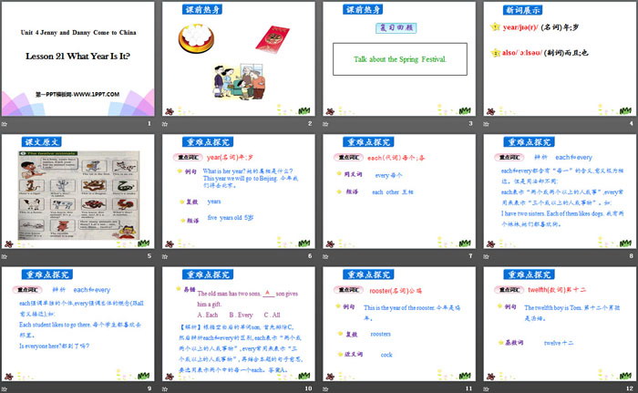 关键词:冀教版五年级上册英语PPT课件免费下载,What Year Is It?PPT下载,Jenny and Danny Come to ChinaPPT下载,.PPT格式;