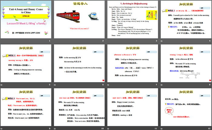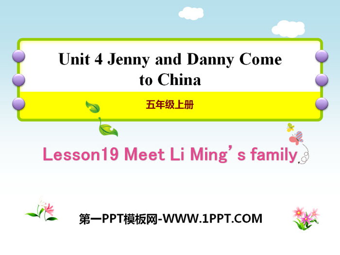 关键词:冀教版五年级上册英语PPT课件免费下载,Meet Li Ming's FamilyPPT下载,Jenny and Danny Come to ChinaPPT下载,.PPT格式;