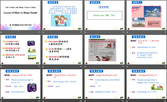 关键词:冀教版五年级上册英语PPT课件免费下载,Meet Li Ming's FamilyPPT下载,Jenny and Danny Come to ChinaPPT下载,.PPT格式;