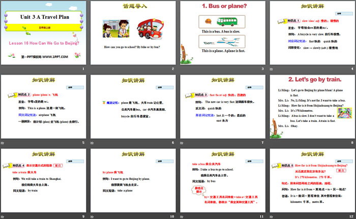 关键词:冀教版五年级上册英语PPT课件免费下载,How Can We Go to Beijing?PPT下载,A Travel PlanPPT下载,.PPT格式;