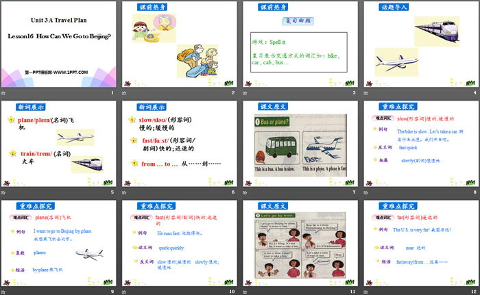 plane (飞机), train(火车),slow(慢的,缓慢的), fast(快的,迅速的),from… to…(从……到……), far(遥远的)