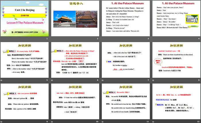 关键词:冀教版五年级下册英语PPT课件免费下载,The Palace MuseumPPT下载,In BeijingPPT下载,.PPT格式;