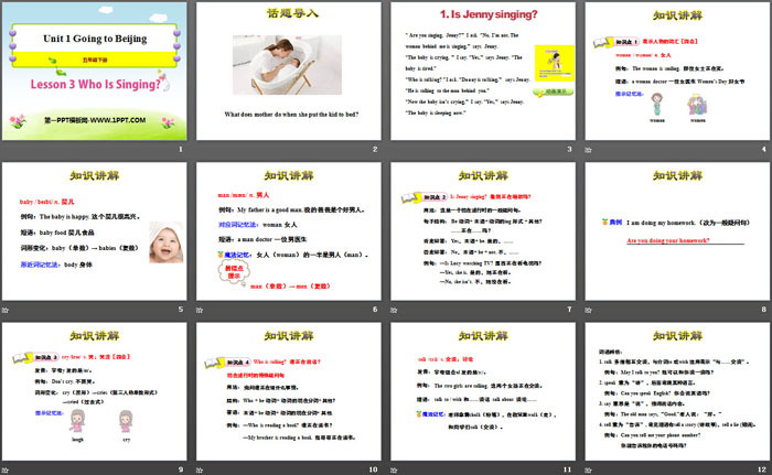 关键词:冀教版五年级下册英语PPT课件免费下载,Who Is Singing?PPT下载,Going to BeijingPPT下载,.PPT格式;