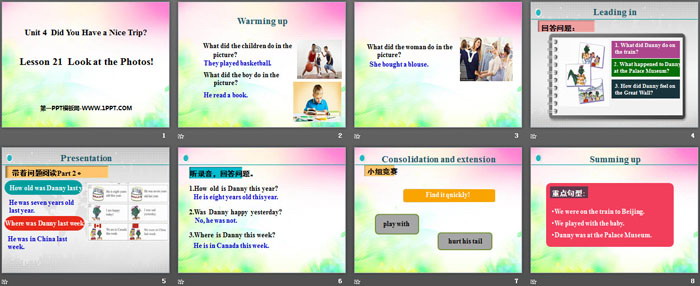 关键词:冀教版五年级下册英语PPT课件免费下载,Look at the Photos!PPT下载,Did You Have a Nice Trip?PPT下载,.PPT格式;