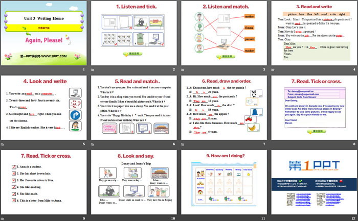 关键词:冀教版五年级下册英语PPT课件免费下载,Again,Please!PPT下载,Writing HomePPT下载,.PPT格式;