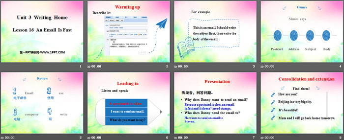 关键词:冀教版五年级下册英语PPT课件免费下载,An Email Is FastPPT下载,Writing HomePPT下载,.PPT格式;