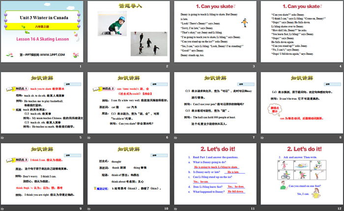 关键词:冀教版六年级上册英语PPT课件免费下载,A Skating LessonPPT下载,Winter in CanadaPPT下载,.PPT格式;