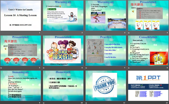 关键词:冀教版六年级上册英语PPT课件免费下载,A Skating LessonPPT下载,Winter in CanadaPPT下载,.PPT格式;