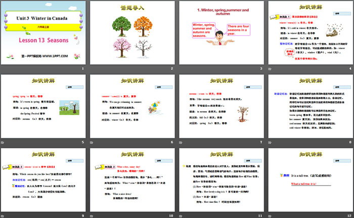 关键词:冀教版六年级上册英语PPT课件免费下载,SeasonsPPT下载,Winter in CanadaPPT下载,.PPT格式;