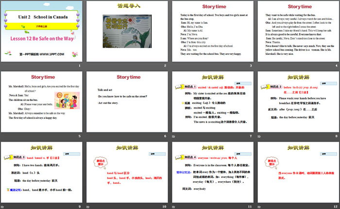 关键词:冀教版六年级上册英语PPT课件免费下载,Be Safe on the WayPPT下载,School in CanadaPPT下载,.PPT格式;