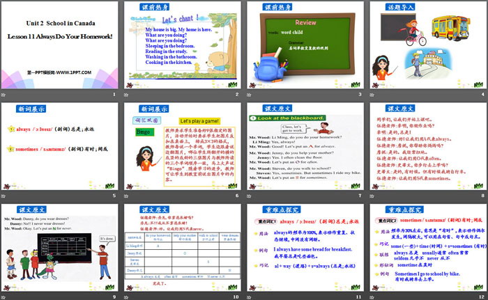 关键词:冀教版六年级上册英语PPT课件免费下载,Always Do Your Homework!PPT下载,School in CanadaPPT下载,.PPT格式;