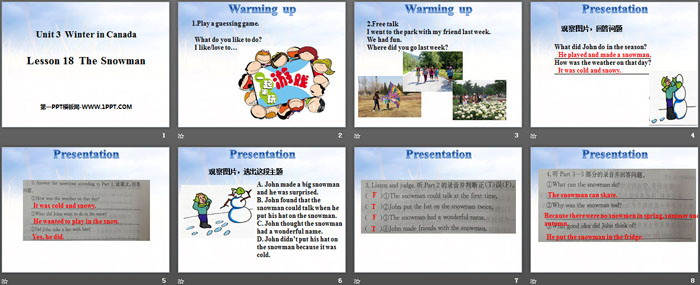关键词:冀教版六年级上册英语PPT课件免费下载,The SnowmanPPT下载,Winter in CanadaPPT下载,.PPT格式;