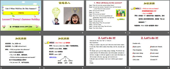 关键词:冀教版六年级下册英语PPT课件免费下载,Danny's Summer HolidayPPT下载,What Will You Do This Summer?PPT下载,.PPT格式;