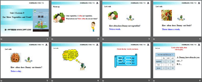 关键词:冀教版六年级下册英语PPT课件免费下载,Eat More Vegetables and Fruit!PPT下载,Good Health to You!PPT下载,.PPT格式;