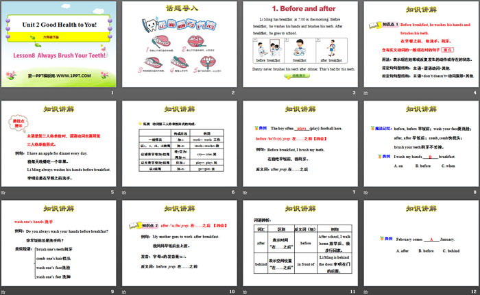 关键词:冀教版六年级下册英语PPT课件免费下载,Always Brush Your Teeth!PPT下载,Good Health to You!PPT下载,.PPT格式;