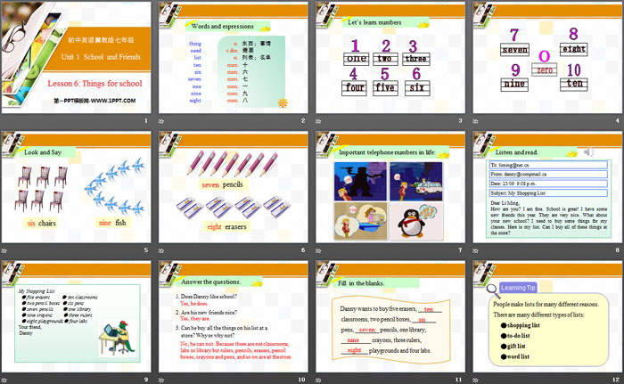 关键词:冀教版七年级上册英语PPT课件免费下载,Things for schoolPPT下载,School and FriendsPPT下载,.PPT格式;