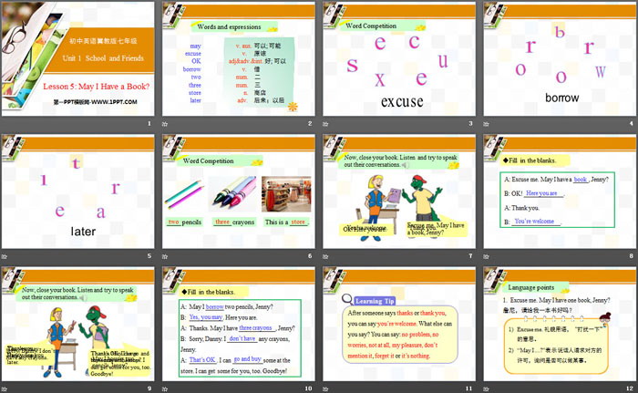 关键词:冀教版七年级上册英语PPT课件免费下载,May I Have a Book?PPT下载,School and FriendsPPT下载,.PPT格式;
