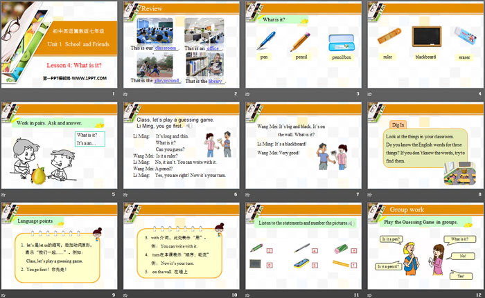 关键词:冀教版七年级上册英语PPT课件免费下载,What is it?PPT下载,School and FriendsPPT下载,.PPT格式;